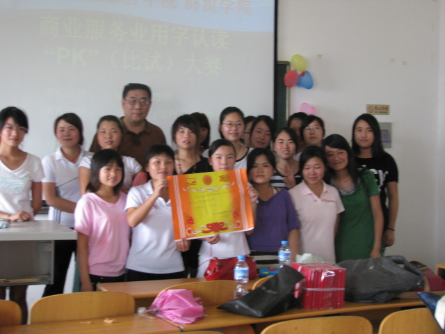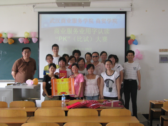 2010年7月1日下午14时。北综教学楼606多媒体教室。一场旨在深化内涵建设、检测教学效果、强化表达技能、打造商贸专业核心竞争力、提高大学生人文素质、培养高素质技能型人才的技能大赛开始了。连锁经营管理教研室与文秘教研室就商业服务业用字(常见字、常用字、常读错字)认读,组织两个专业的09级学生进行了激烈的“PK”(比试)。