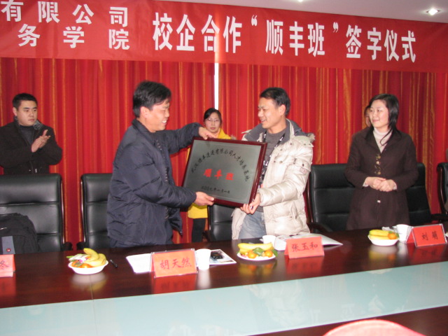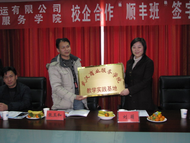 在签字仪式上,校企双方同时进行了授牌活动。顺丰集团速运有限公司授予我院为其人才培养基地,我院在武汉顺丰速运有限公司建立教学实训基地。根据协议要求,我院每年从物流管理专业中选拔40名学生组建“顺丰班”,在完成学校规定的教学任务前提下,按照公司的要求单独制定教学计划,进行为期2个月的企业岗前培训。学生的专业见习和顶岗实习都在公司进行,毕业后公司安排学生就业。