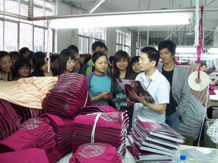 08年5月9日上午,商贸学院07电子商务专业学生在专业老师和辅导员涂晓玲的带领下,到江汉开发区爱帝集团工业园进行了参观。同学们在厂内师傅的带领下观看了爱帝服装的主要制作流程。参观过程中,同学们认真听取了领队师傅的讲解,并积极发问。