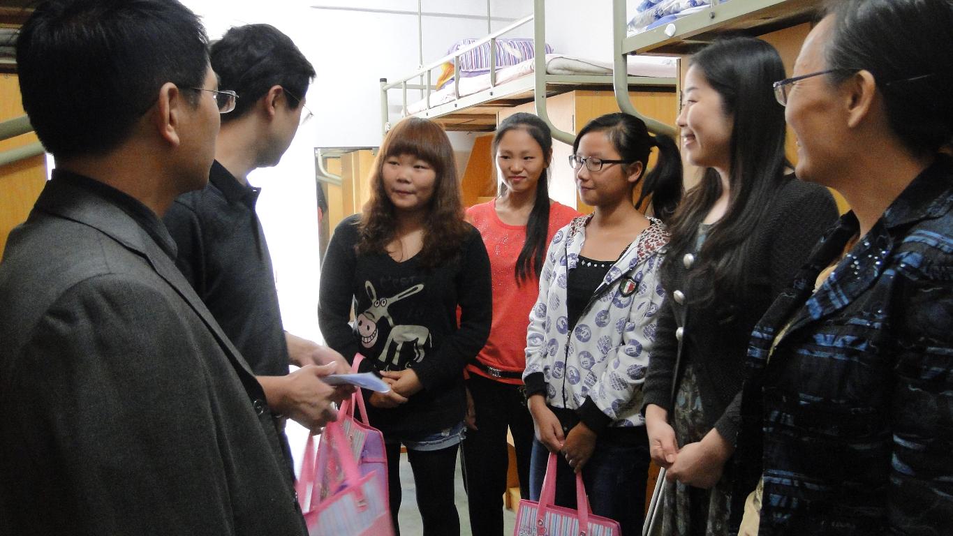 这次走访的寝室是大一营销与策划专业的学生们。走进寝室,我们看到了热情的学生,整洁的寝室。当老师们把精心准备的书籍赠与她们时,同学们非常地高兴和感激。