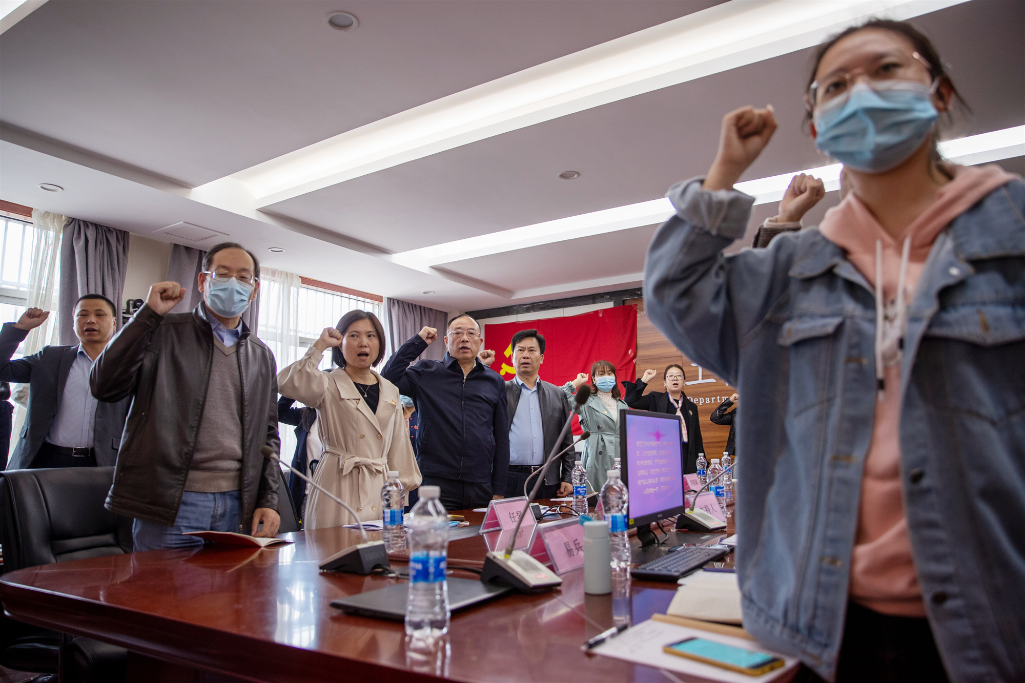 全体党员起立奏唱国歌、重温入党誓词,深入学习习近平总书记在全国抗击新冠肺炎疫情表彰大会上的讲话精神。教师三支部书记、湖北省抗击新冠肺炎疫情先进个人易兵结合疫情期间自己和支部成员疫情防控工作讲授以弘扬伟大抗疫精神的主题党课。疫情期间,教师三支部成员利用互联网技术优化党建工作,支部成员坚守岗位,易兵积极参与社区防控工作,为社区居民做好筛查和心理抚慰工作,并参加了湖北省“我们在一起”的广播节目,曾引起媒体广泛报道。