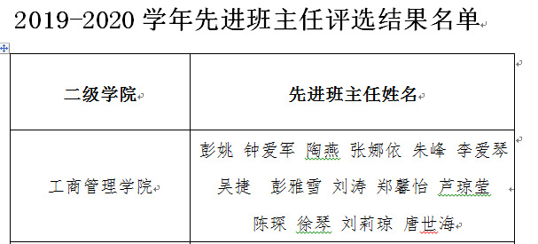 为加强qy球友会千亿官网学生思想政治教育工作队伍建设,充分发挥班主任在大学生思想政治教育和管理中的作用,切实提高教书育人和管理服务水平,推动学风建设的健康发展,根据《qy球友会千亿官网关于加强辅导员、班主任队伍建设的实施意见》(武商院党办〔2013〕8号)和《qy球友会千亿官网班主任管理暂行办法》(武商院党办〔2013〕9号),经各学院推荐,学校综合评定,授予夏黎等18位老师“2019-2020学年度qy球友会千亿官网优秀班主任”称号,授予丁鹏等55位老师“2019-2020学年度qy球友会千亿官网先进班主任”称号。