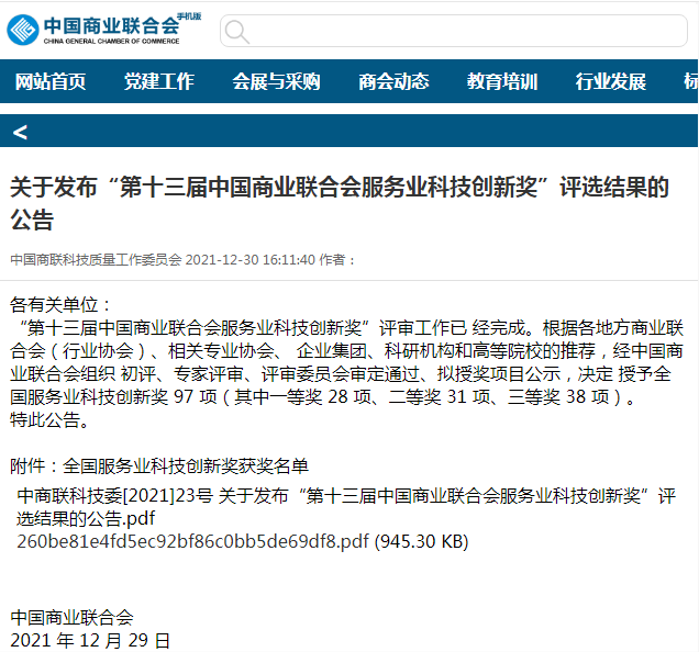 “中国商业联合会服务业科技创新奖”是经国家科技部、国家科学技术奖励工作办公室批准设立的奖项,旨在通过奖励服务业领域的技术产品、管理制度、经营理念、流通秩序、基础设施等方面创新卓著的组织和个人,进一步推动服务业企业的科学发展。在科技部、商务部等有关部委的指导和支持下,该奖项为推动我国商业服务业科技发展创新做出了积极贡献。