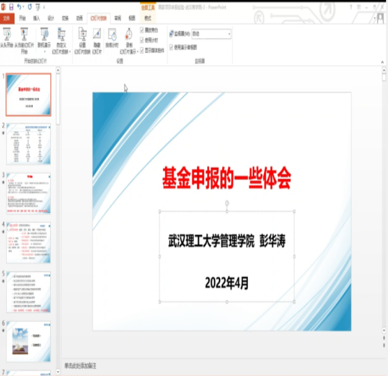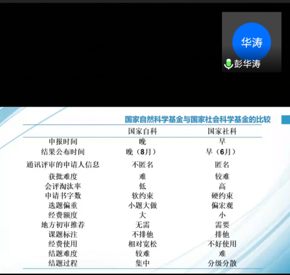 4月26日下午,武汉理工大学管理学院教授、博士生导师彭华涛受邀,在腾讯会议上为qy球友会千亿官网教师倾心分享了国家自然科学和国家社会科学基金申报的心得体会。会议吸引了qy球友会千亿官网博士教师、青年教师、骨干教师50余人参加。