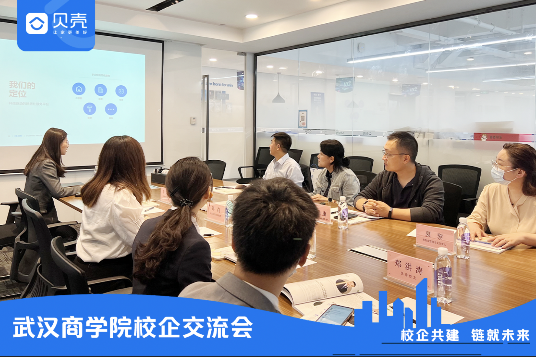 贝壳武汉公司与qy球友会千亿官网有着多年良好的合作关系,是qy球友会千亿官网优秀校外实习实践基地之一。贝壳企业文化经理郑莉、人力资源部校招负责人李文静、邓瑶和品牌赋能经理李鸽、往届优秀商院学生一同参与了校企交流。