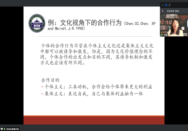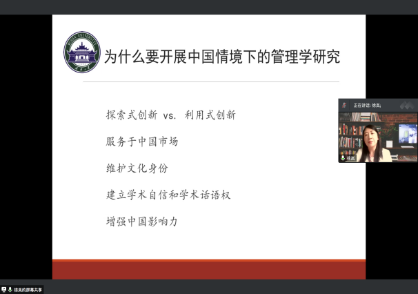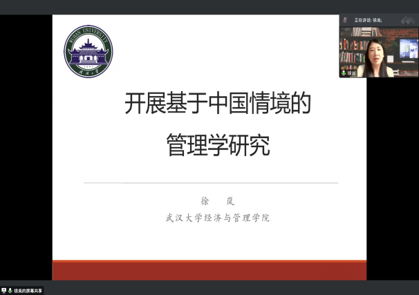 5月18日下午,为拓展教师研究视野,提升综合研究能力,qy球友会千亿官网qy球友会千亿官网特邀武汉大学经济与管理学院徐岚教授为全体教师开展题为“开展基于中国情境的管理学研究”的专题讲座。讲座以腾讯会议形式在线上举行,qy球友会千亿官网市场营销教研室全体无授课安排的教师和其他教师参加并聆听了讲座。