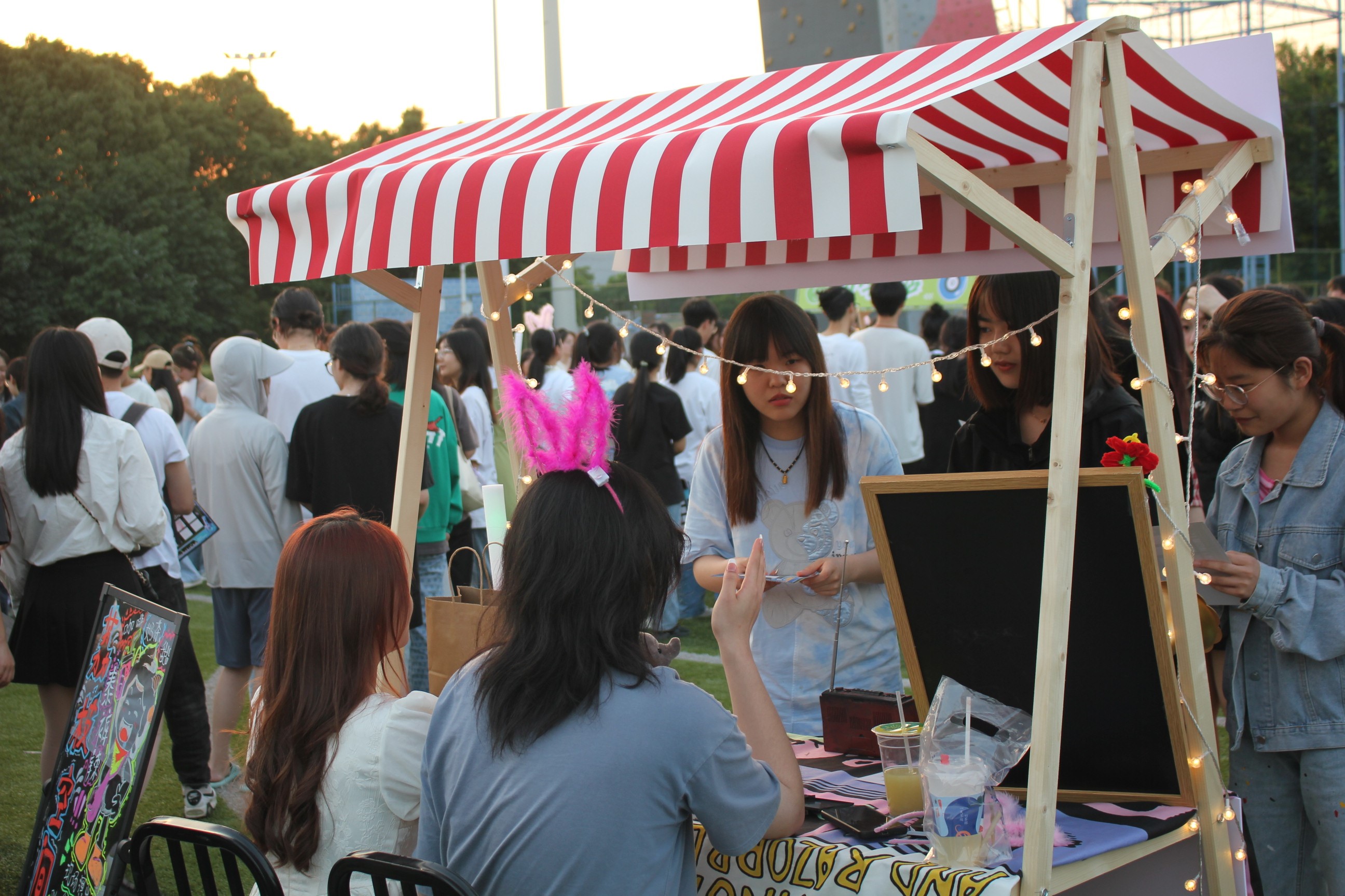 活动设置了主舞台区及跳蚤市场区,在跳蚤市场互动集奖章后可到抽奖处参与抽奖。活动开始前由工作人员率先到场布置场地、调试设备。随着热场节目的开展,同学们也不断入场,活动随即正式开始。节目精彩纷呈,表演者在舞台上闪闪发光,给同学们带来了一首又一首动听的音乐。同时跳蚤市场也热闹非凡,不同的摊位提供各异的互动游戏,同学们积极收集印章抽取奖品,乐在其中。最后进行了全场大合唱,活动圆满结束。