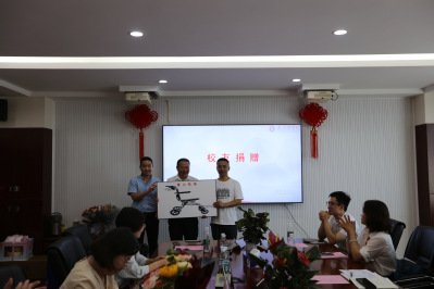 2005级校友鲁坤鹏为2023级学妹捐赠轮椅及大礼包,梅校长代表学校接收捐赠并转交学生家长。