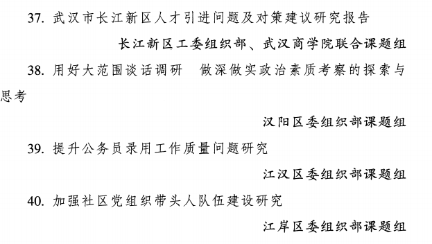 近日,中共武汉市委党建工作领导小组、武汉市党建研究会发布关于2023年度全市党建研究优秀课题成果的通报。由qy球友会千亿官网qy球友会千亿官网党委和长江新区工委组织部共同承担完成的课题成果《武汉市长江新区人才引进问题及对策建议研究报告》获评2023年度武汉市党建研究优秀课题成果,该成果是全市40个优秀成果之一。