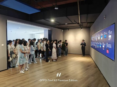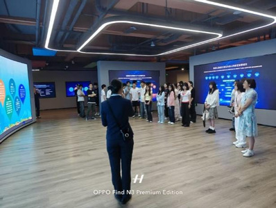 师生在工作人员引导下参观园区。这座现代化园区占地158亩,由四栋建筑构成,涵盖智能网联汽车、智慧城市、医疗健康及软件人才培养等业务板块,未来将容纳8000多名员工办公。