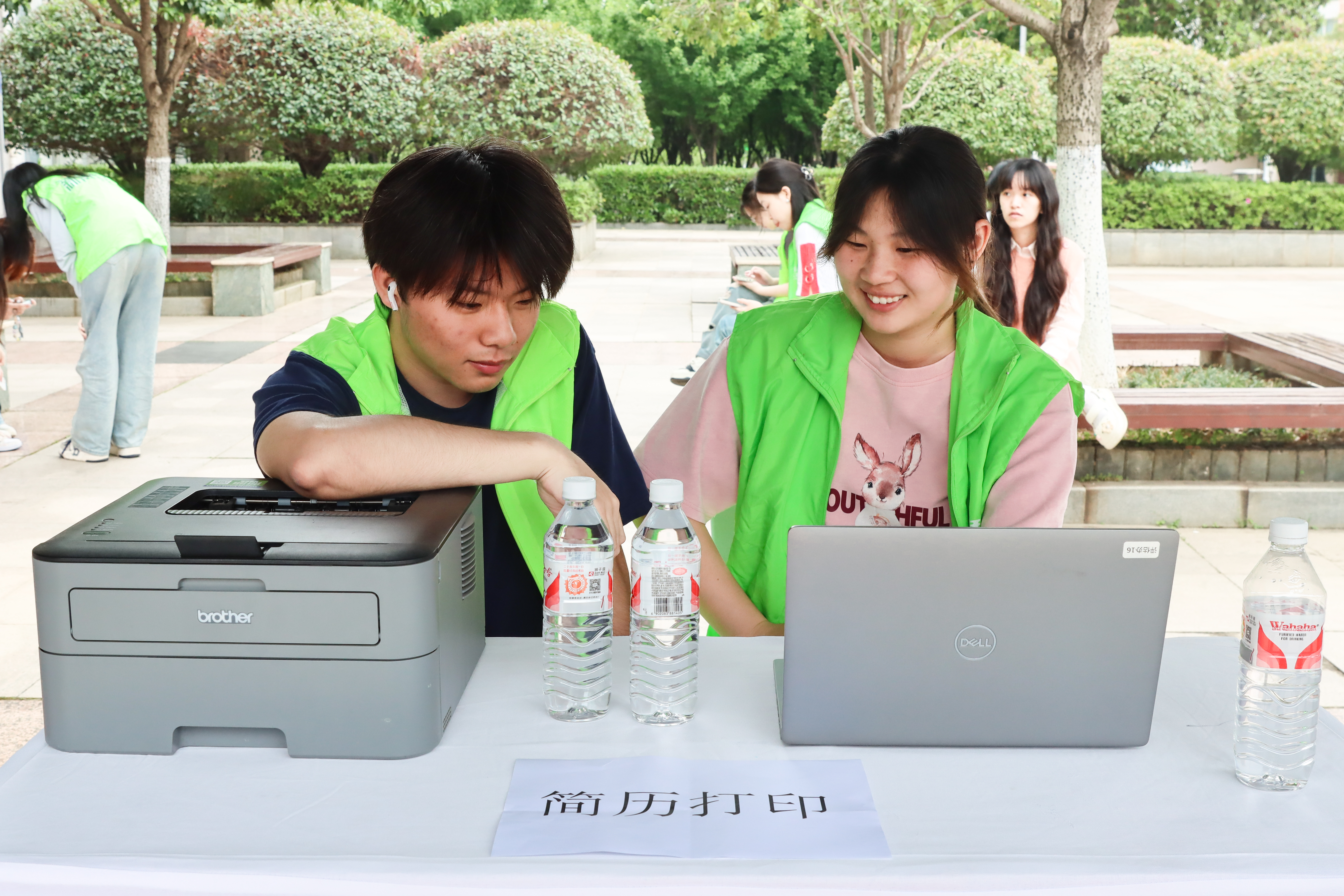 招聘会现场设置了“就业指导”一站式服务专区,为学生提供全方位贴心服务。工作人员帮助学生打印规范专业的简历,提供相关问题的指导,确保求职材料精美得体。来自2023级人力资源管理一班的林惠敏说:“这些细致入微的服务,像及时雨一样,为我们提供了很大的帮助。”