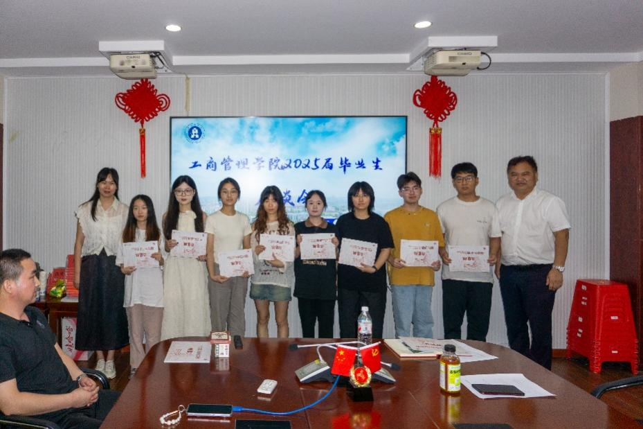 座谈会尾声,学院向毕业生赠送定制纪念册与徽章,师生共同书写祝福卡片投入“时光信箱”,约定未来启封重温此刻情谊。熊文杰书记在总结中号召学子们践行“商道惟诚,知行致远”的校训,勇于担当价值创造,并欢迎大家常回母校。全体与会人员合影留念,为这场充满温情与力量的交流画上圆满句号。